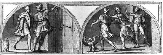 (* Cremona 1522, wirkte in Cremona, † Reggio Emilia 1591) Jupiter und Merkur als sterbliche Reisende klopfen an, und Jupiter und Merkur werden abgewiesen Studien zu den Fresken von Campi in Sabionetta undatiert, 83 x 259 mm [traditionell: G. A. Figino, Zuordnung nach L. Turcic] |